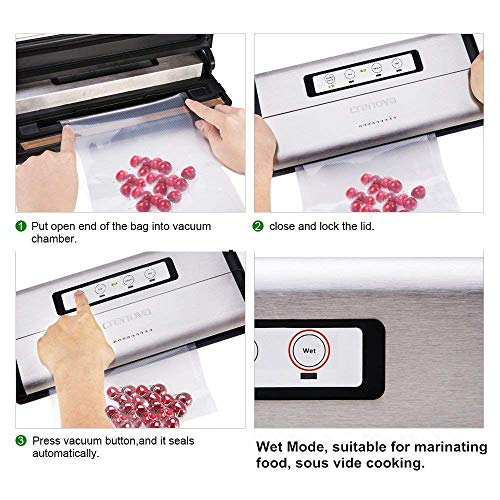 Crenova VS100s possiede una serie di funzioni che implementano le qualità dell’apparecchio in cucina: il sistema di sottovuoto 2-in-1 è completamente automatico, potendo scegliere tra il semplice sigillo e quello con aspirazione sottovuoto. Il dispositivo presenta poi le funzioni funzione Push-on e Release off con spegnimento automatico, e il sottovuoto istantaneo della funzione Pulse aiuta a proteggere i cibi delicati durante l’intera procedura di sigillo, per cui il sottovuoto si arresta solo quando raggiunge una pressione negativa. La diminuzione della pressione di 80 Kpa elimina completamente l’aria interna e sigilla il lembo di chiusura, per cui il cibo rimane protetto da muffa o insetti, allungando la vita degli alimenti fino a 6 volte di più. Infine ricordiamo che il macchinario presenta un uso più esteso che non si limita al cibo, ma comprende anche l’ imballaggio di lettere, giornali, vestiti, lenzuola e molti altri articoli per la casa che hanno bisogno di protezione da polvere e umidità.